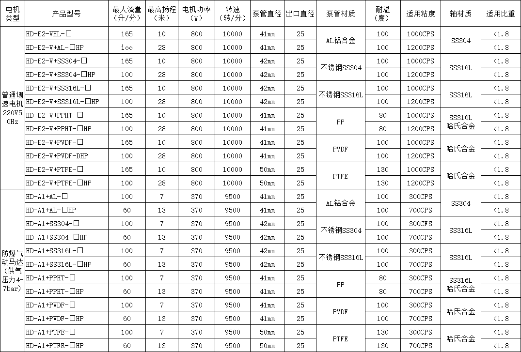HD系列電動(dòng)抽油泵根據(jù)所輸送的液體性質(zhì),泵體沾濕部分材料可選用鋁合金、優(yōu)質(zhì)不銹鋼,增強(qiáng)聚丙烯等組成。驅(qū)動(dòng)電機(jī)配備單相標(biāo)準(zhǔn)電機(jī),防爆電機(jī),高轉(zhuǎn)速電機(jī)等多種選擇。電機(jī)外殼采用優(yōu)質(zhì)PC聚碳合成塑料,根據(jù)所配置泵體材質(zhì)和電機(jī)的不同,型號(hào)可分為三大系列10種型號(hào),該系列泵可按防爆區(qū)域和非防爆區(qū)域選用,如在易燃易場(chǎng)合使用,可選用我公司生產(chǎn)的防爆型電動(dòng)抽液泵。使用防爆型電動(dòng)抽液泵時(shí)應(yīng)正確使用防爆插頭插座。RPP塑料:非較性、無污染、有耐酸堿鹽類等腐蝕性化學(xué)液體。工作溫度:-14~100℃。
